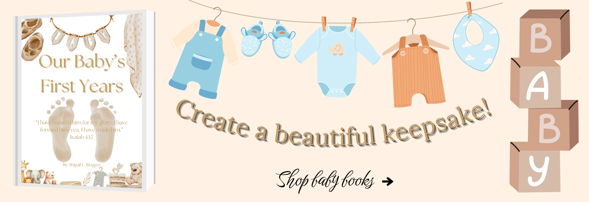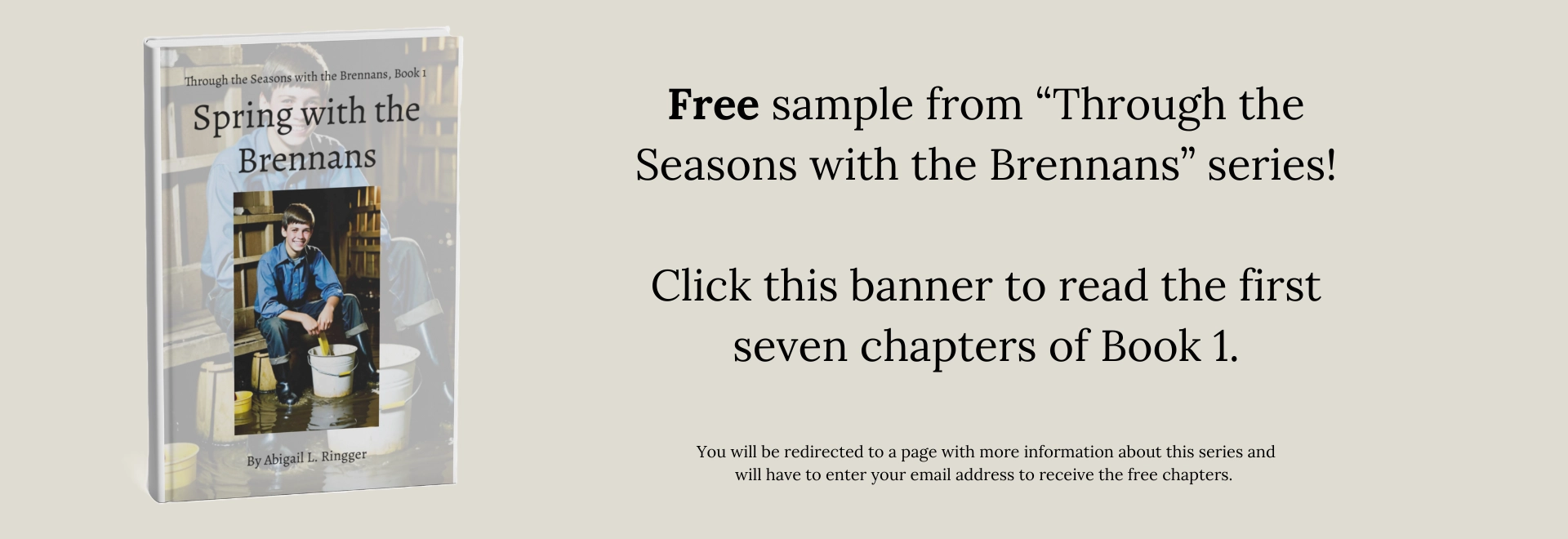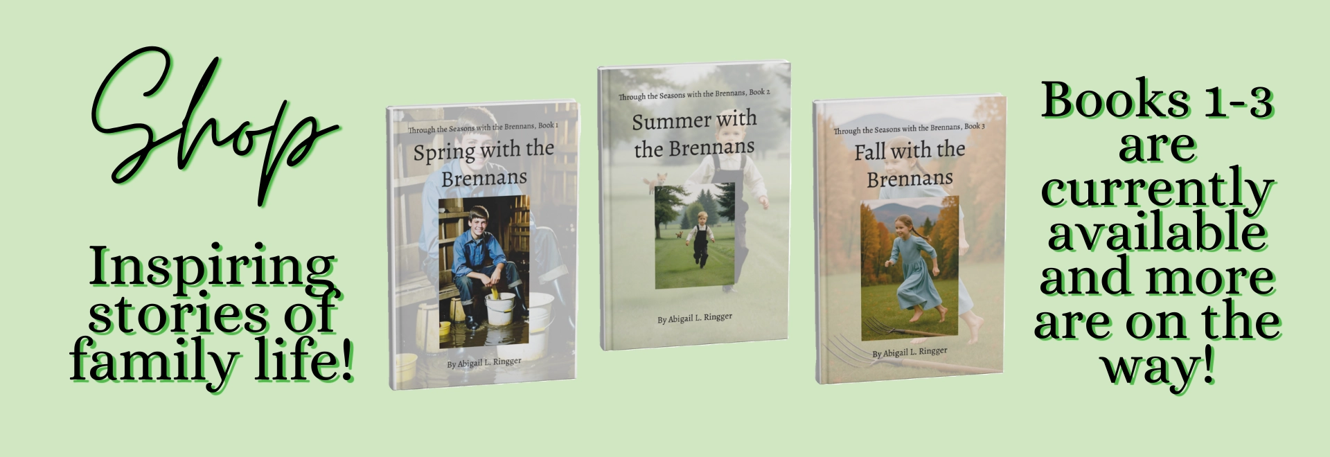 A quick word about the products available on our site (under the "Shop Books" tab): Through the Seasons with the Brennans is a 12-book series, but they haven't all been released yet, so keep your eyes open for new releases! We'll also announce it to our email subscribers, so if you're not on our list, scroll down to the bottom of this page and sign up. The Household Planner, Food Preservation Record Book, and two options for Our Baby's First Years are also currently available.